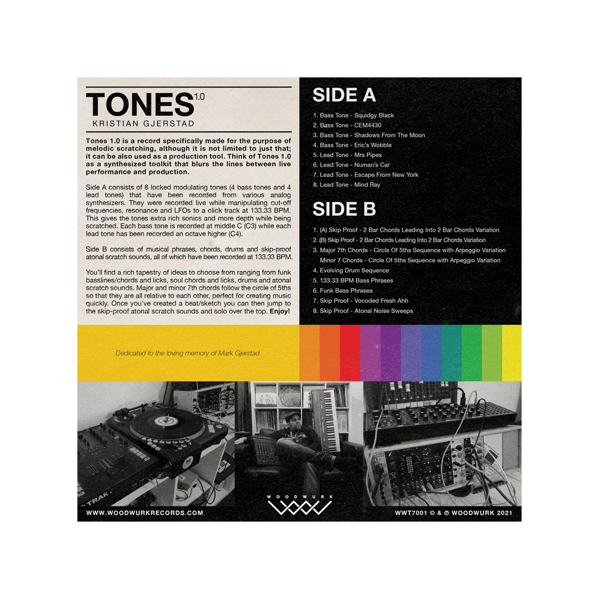 Debut release by renowned Turntablist and inventor of the 'Button Box' Kristian Gjerstad. Tones 1.0 is a record specifically made for the purpose of melodic scratching, although it is not limited to just that; it can be also used as a production tool. Think of Tones 1.0 as a synthesized toolkit that blurs the lines between live