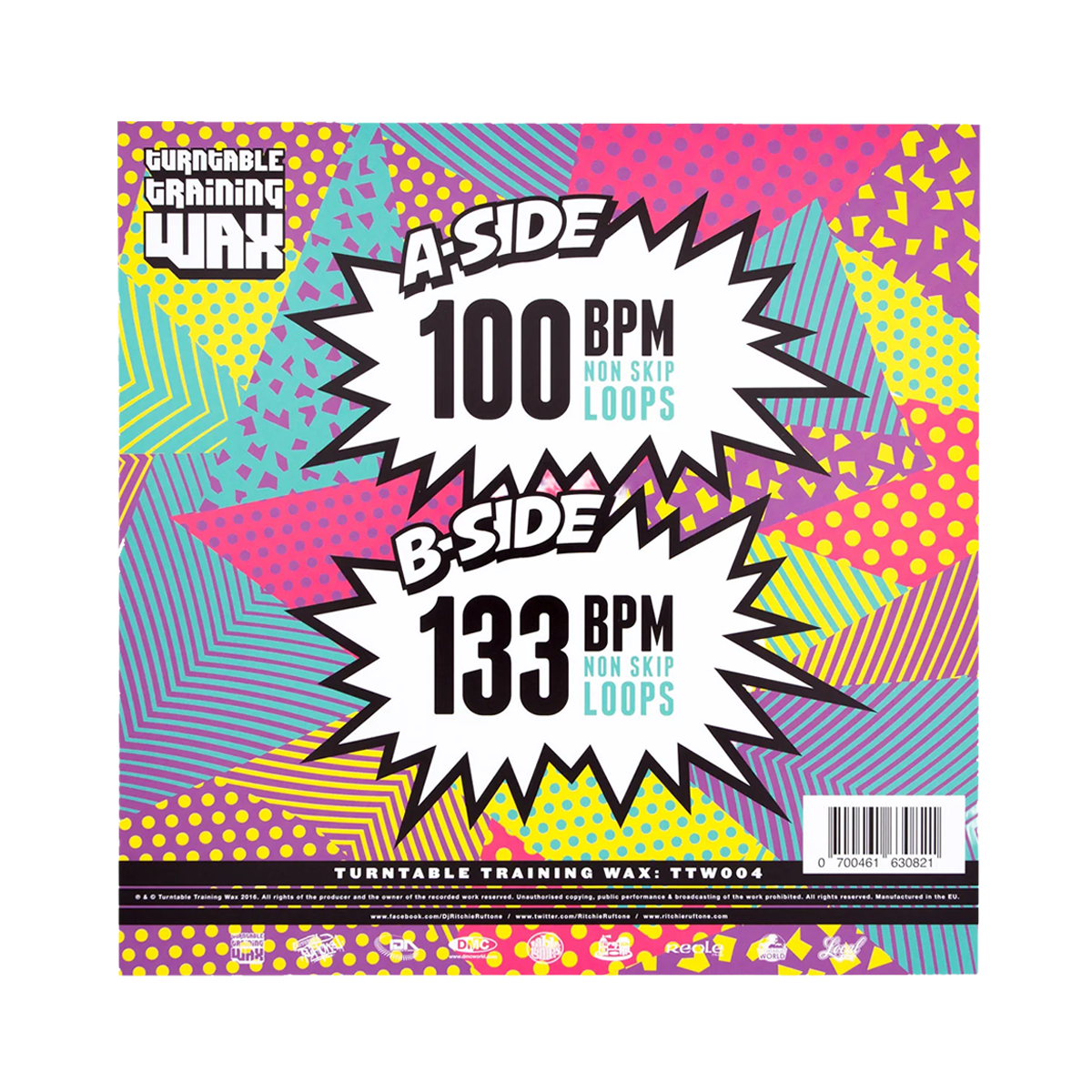 An ultra-pitch non skip DJ scratch tool on vinyl by Ritchie Ruftone, with one side at 100bpm and the flip side at 133bpm.